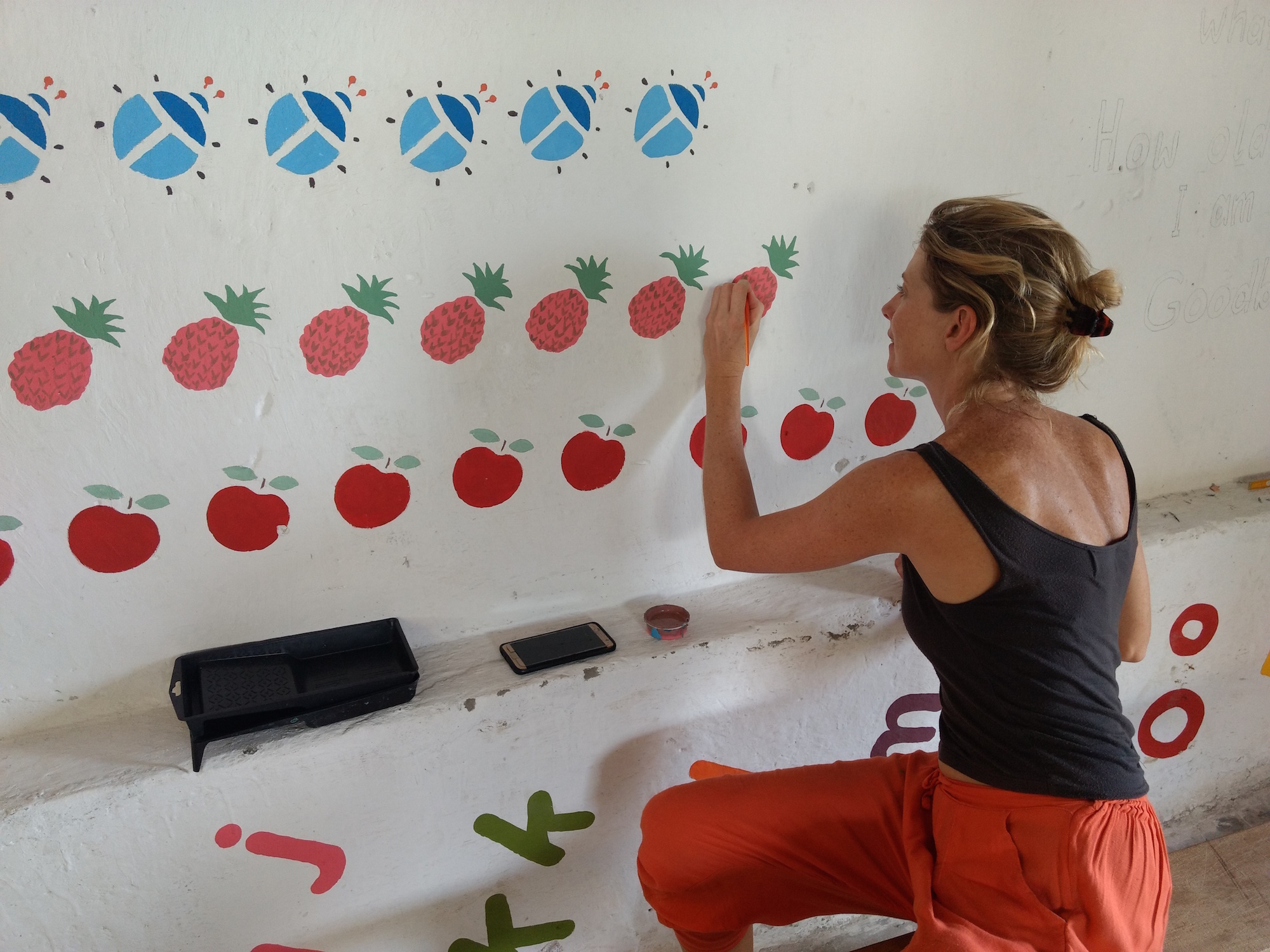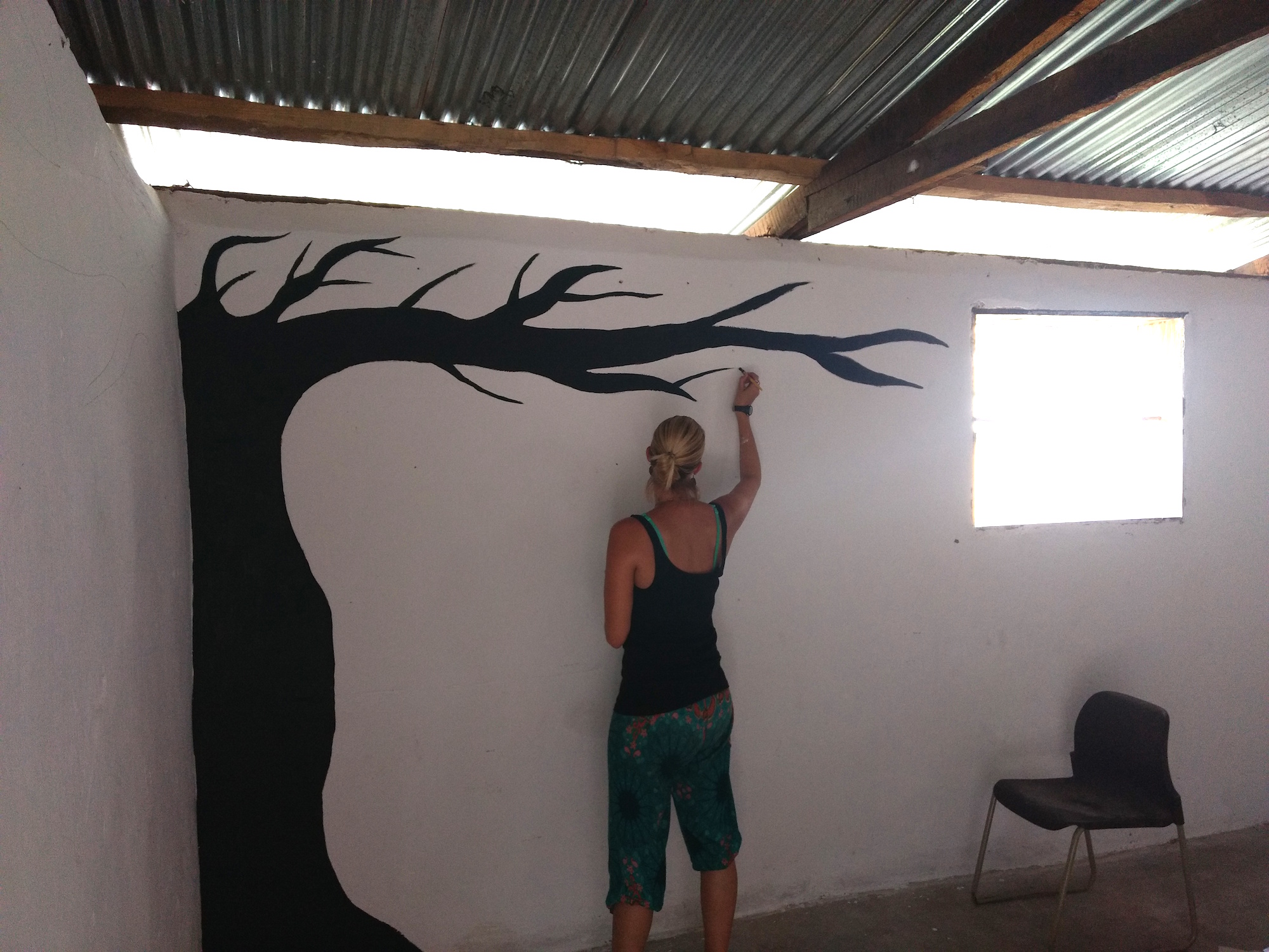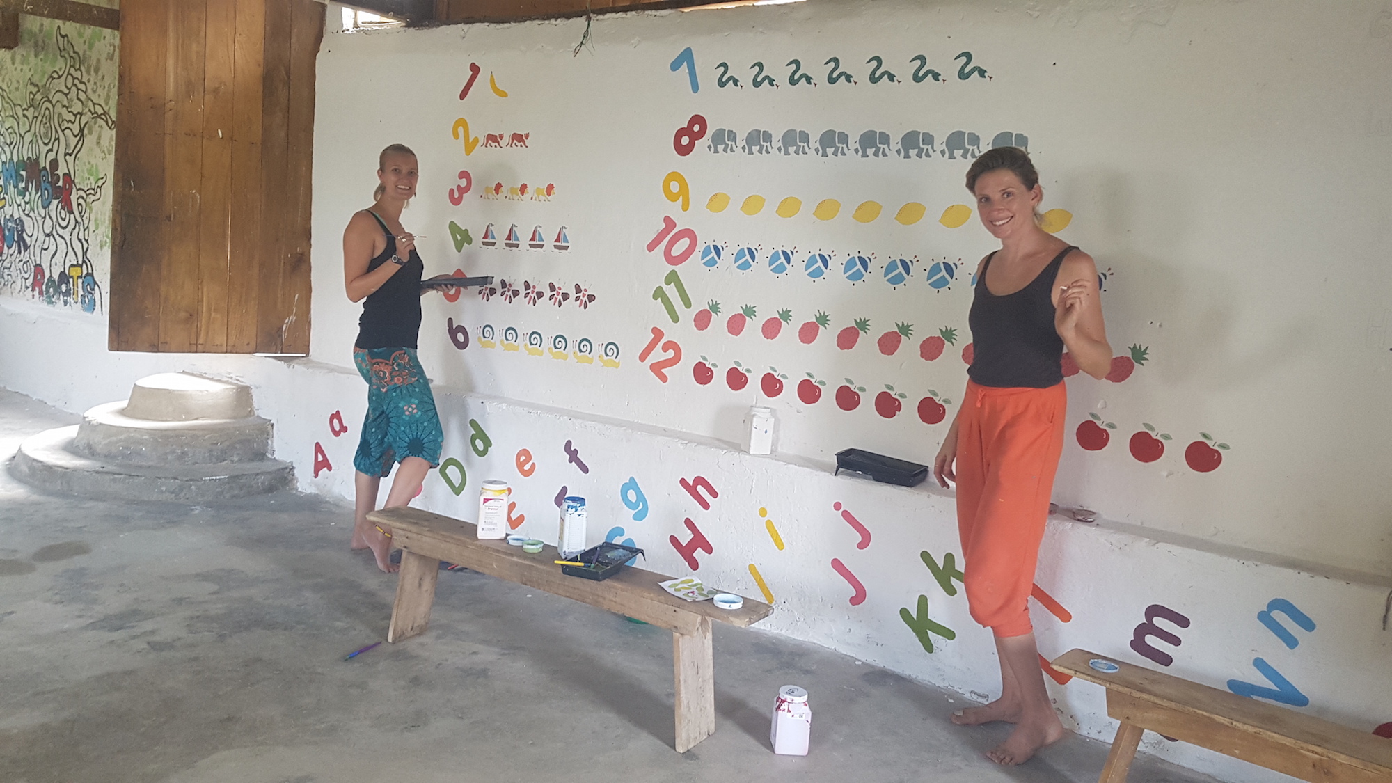 After the initial whitewashing of all the walls, the plan was mapped out and painting took 5 weeks in total. Cara enthusiastically encouraged guests from nearby Zulunkhuni River Lodge to come and join in as well as staff from NYM, children in the Youth Club and community members passing through. It really was a whole community activity and the nursery and youth club members really benefit from these murals every day, both as they are so bright and cheery and also from an interactive learning point of view. Cara – we thank you and all your volunteers for your vision and wonderful energy throughout this project – you have given the Youth Hall a new lease of life!