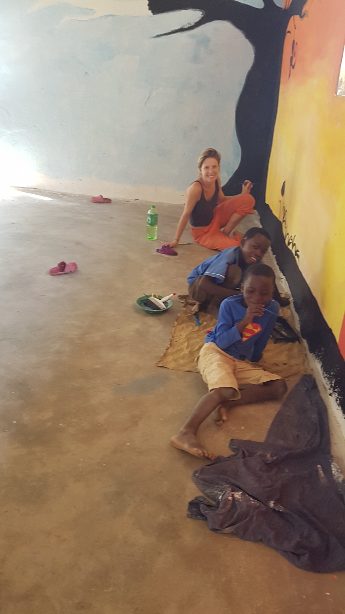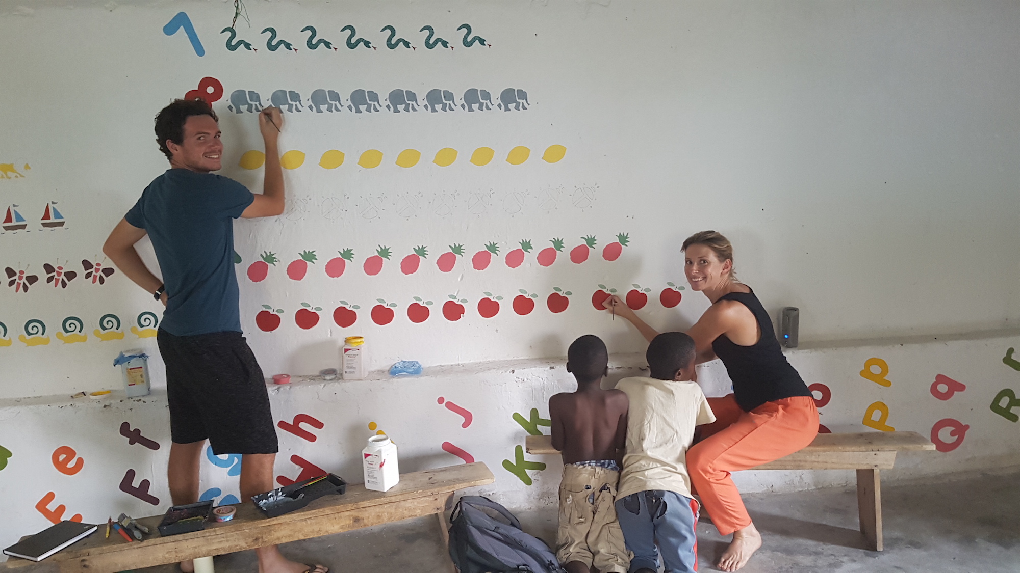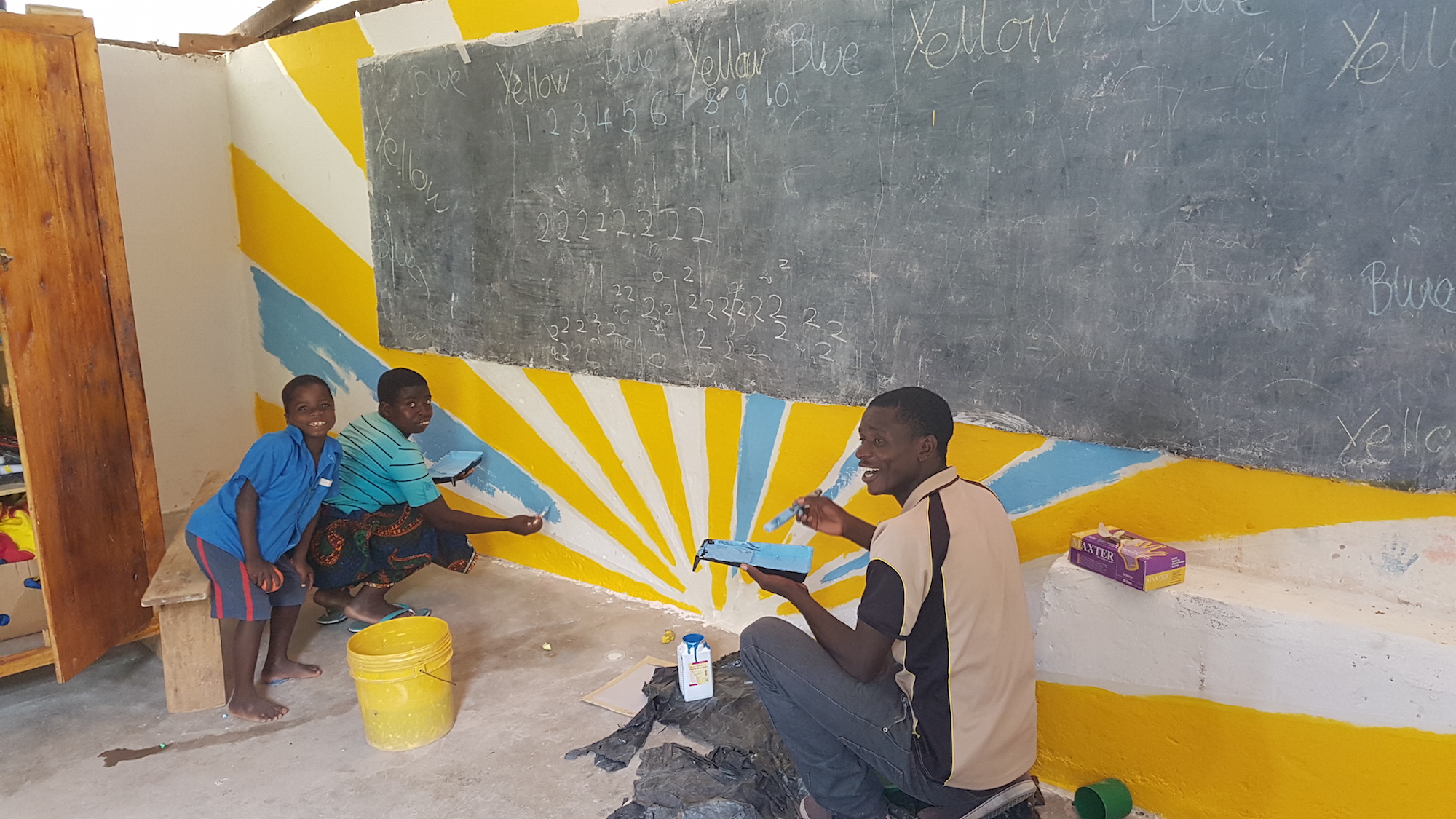 After the initial whitewashing of all the walls, the plan was mapped out and painting took 5 weeks in total. Cara enthusiastically encouraged guests from nearby Zulunkhuni River Lodge to come and join in as well as staff from NYM, children in the Youth Club and community members passing through. It really was a whole community activity and the nursery and youth club members really benefit from these murals every day, both as they are so bright and cheery and also from an interactive learning point of view. Cara – we thank you and all your volunteers for your vision and wonderful energy throughout this project – you have given the Youth Hall a new lease of life!