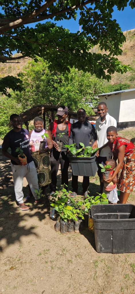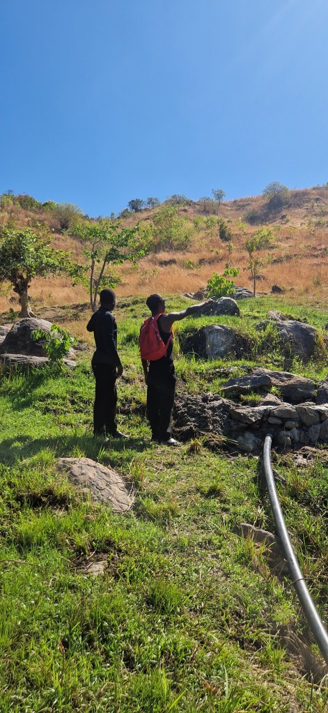 Several of the indigenous tree species were specifically selected for their deep tunnelling root systems, which play a vital role in water management. Together, the group planted some of these trees around the natural spring just above NYM’s land. This spring provides year-round water to both Nyumba ya Masambiro and the health centre next door. The trees’ deep roots help create channels down to the water table, drawing water upwards and helping to ensure the spring continues to flow even during the dry season. In addition, their roots stabilise the soil on the hillside, while their branches and broad leaves provide shade to reduce water loss through evaporation.